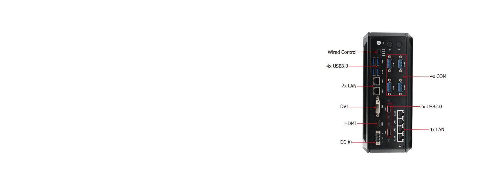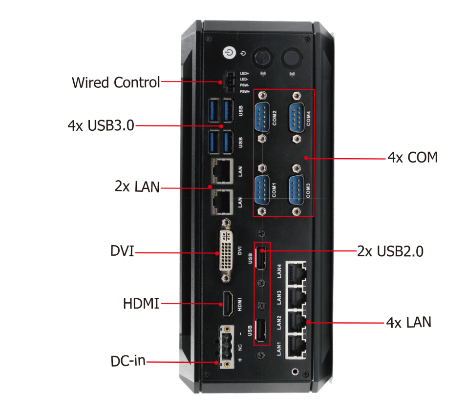Rich I/O ports: 6× LAN, 4 × COM, 4x USB3.0, 2x USB2.0, 1x DC-in